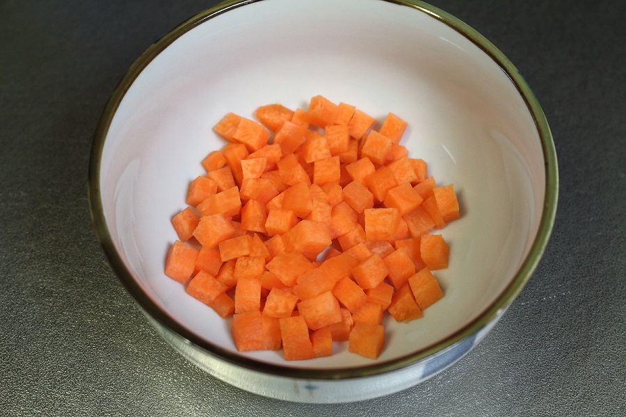 写真のように適量のにんじんを、あまり細かくないみじん切りにして皿に入れます。更に水も入れてラップしレンジで温め、柔らかくしましょう。 (→500W、10分ぐらい) |