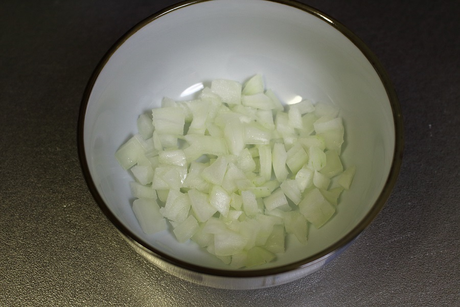 玉ねぎ(1/4個)を写真のようにあまり細かくないみじん切りにして、皿に入れておきます。 |
