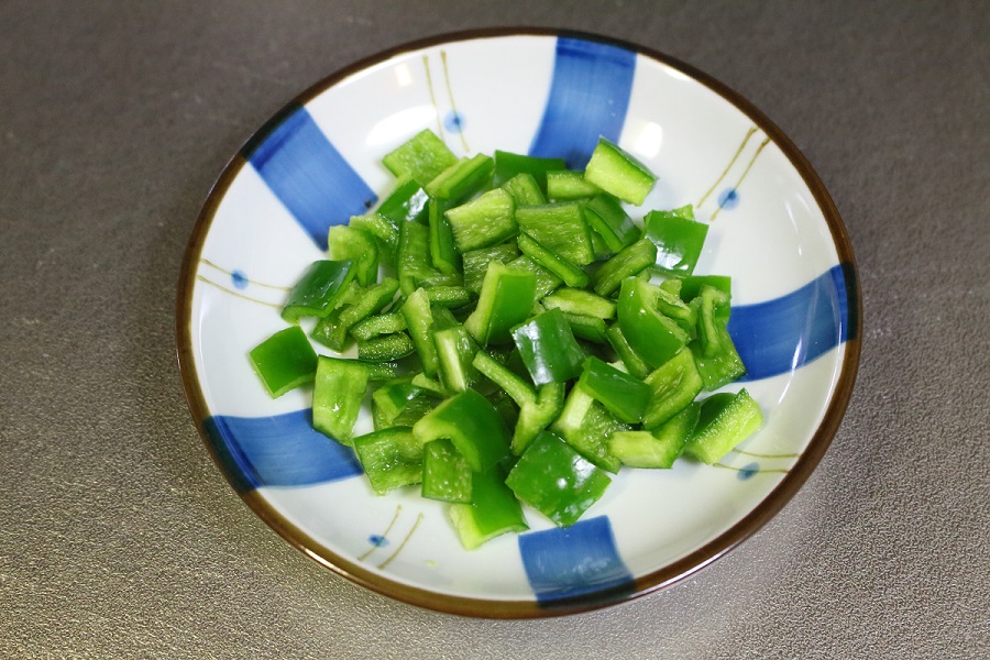 ピーマン(1個)を写真のようにあまり細かくないみじん切りにして、皿に入れておきます。 |