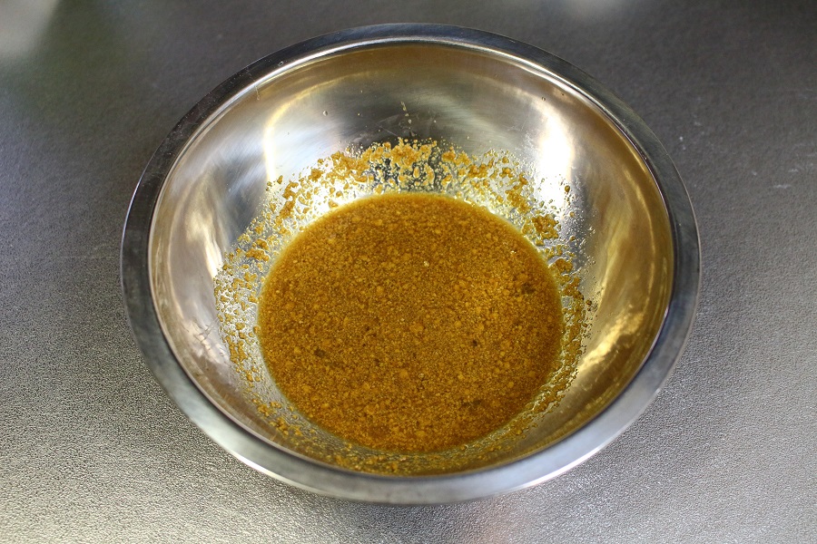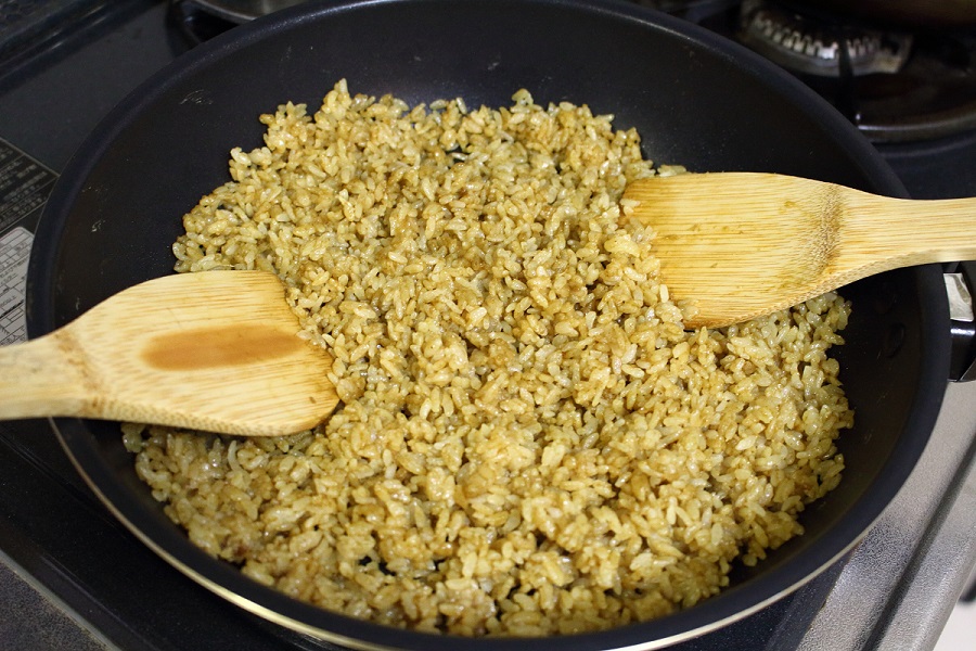 上記⑤で作成したものを手順1のご飯のボールに入れ、スプーンを2つ使って混ぜる。