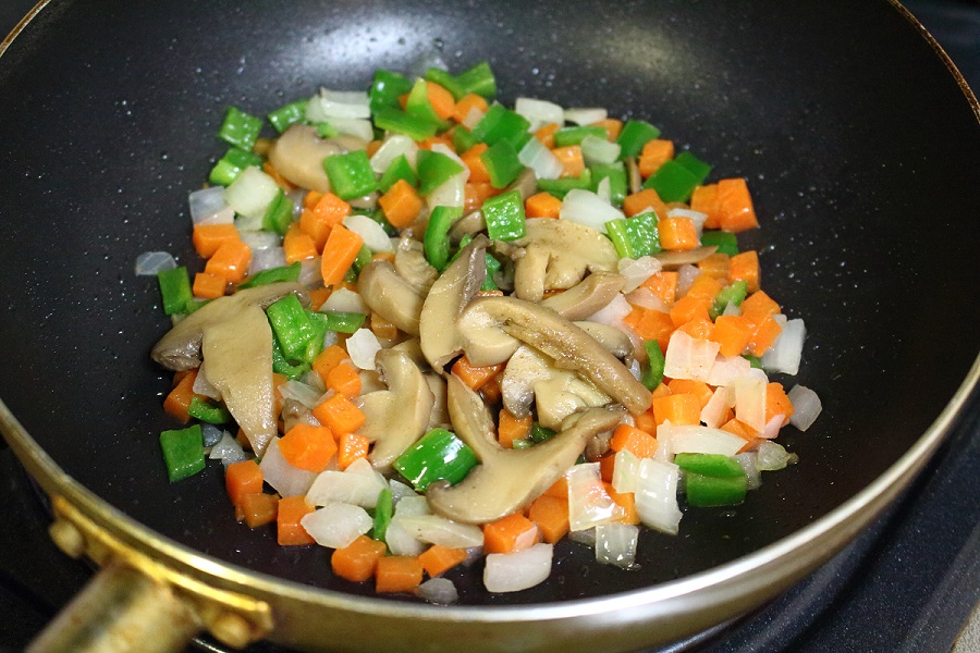 玉ねぎ、マッシュルーム、ピーマンをフライパンに入れ、菜箸で混ぜながら炒めます。 |