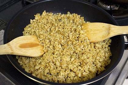 竹べら2本は左右のそれぞれの手に持ち、両手でなるべく手早く攪拌しパラパラに仕上げる。 (水分が飛び、ある程度パラパラになるまで炒める。ただし炒めすぎてパサパサにならないよう気を付ける。) |