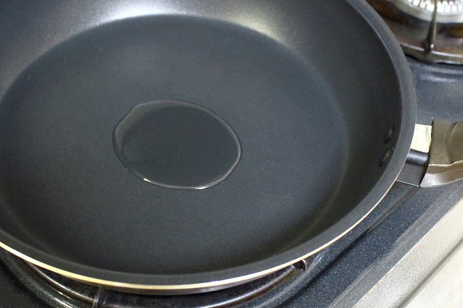 写真のように、蓋つきフライパンに、まずサラダ油を入れましょう。 |