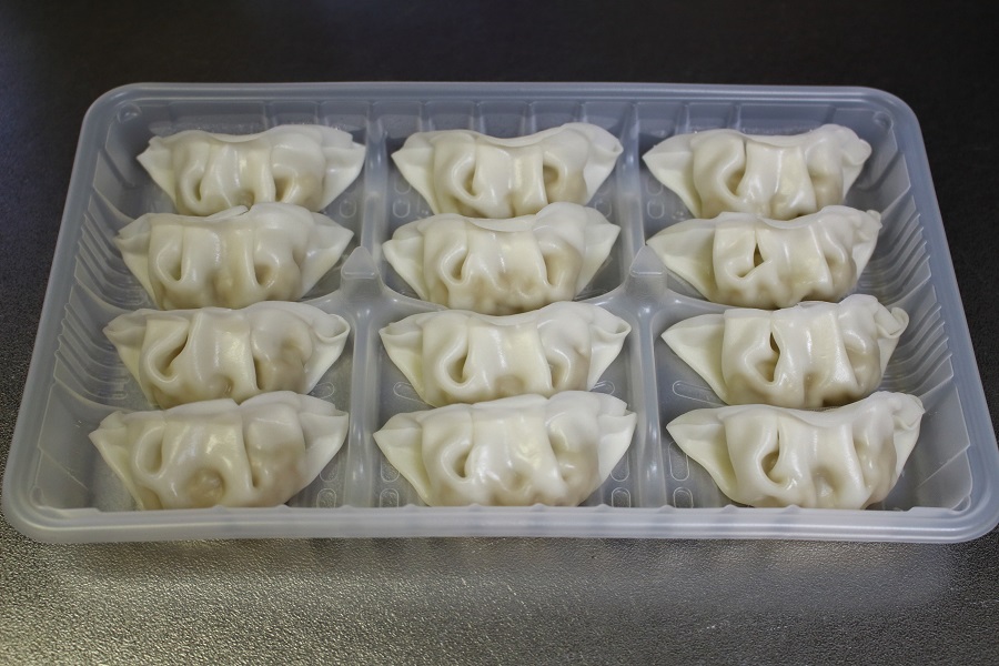 冷凍餃子のビニール包装を取り去ります。 これで餃子の準備ができました。 |