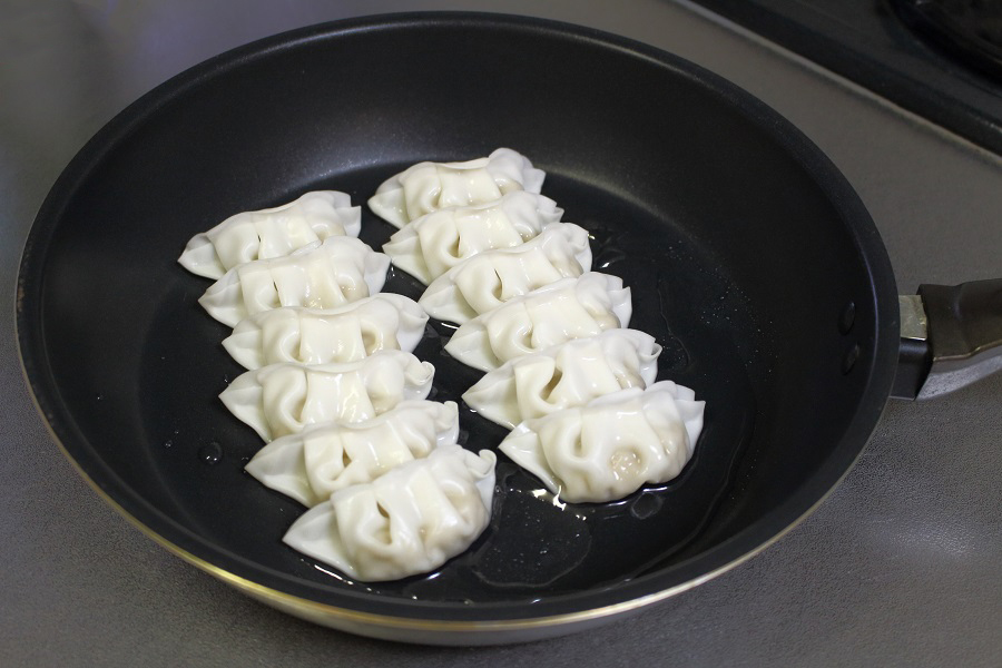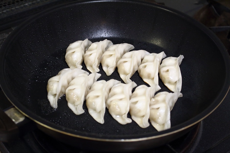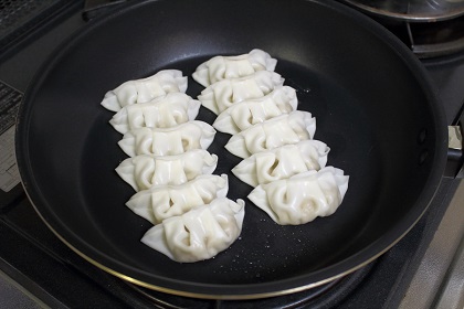 →餃子を蒸し焼くので、蓋つきフライパンを使用します。 |