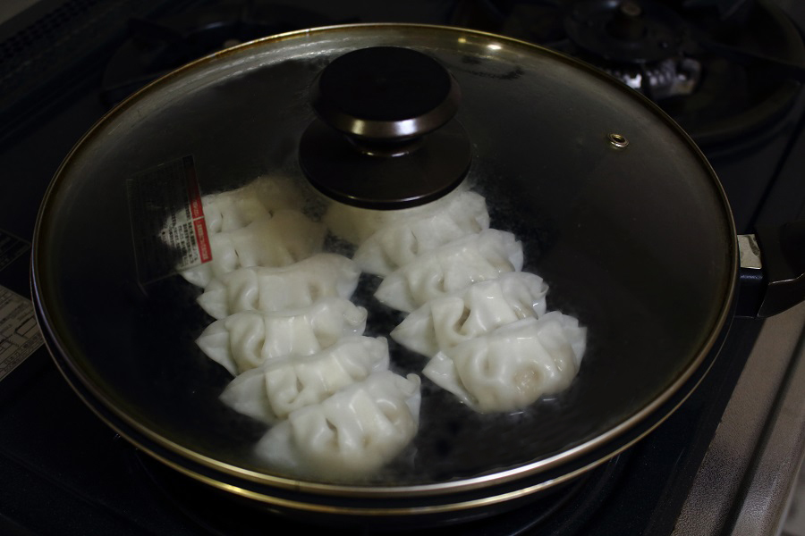 餃子を蒸し焼くため、写真のように蓋つきフライパンに蓋をします。 |