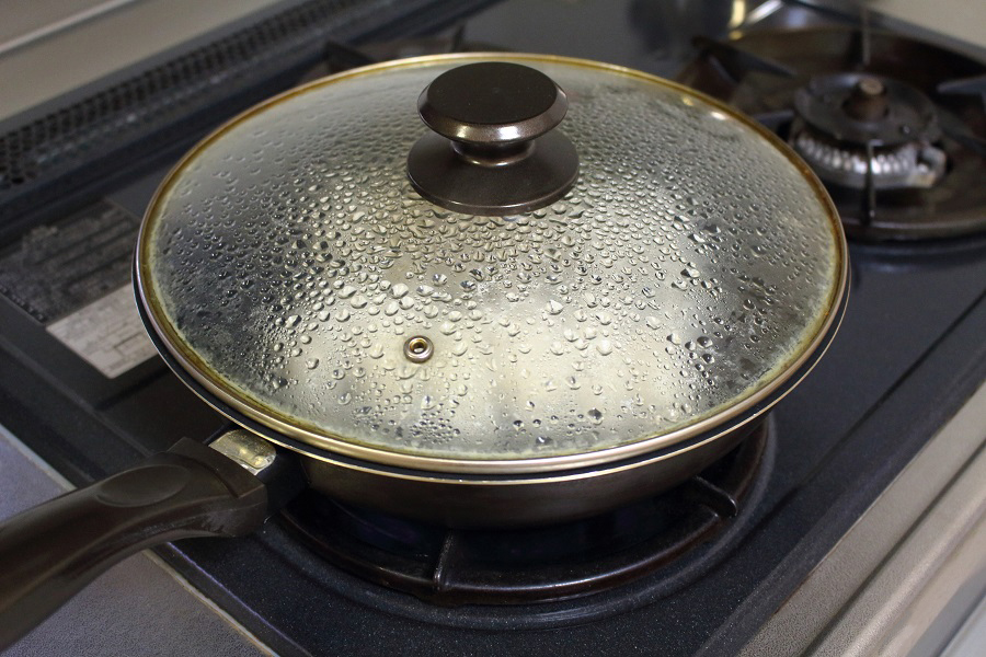 餃子を入れたフライパンに蓋をする。