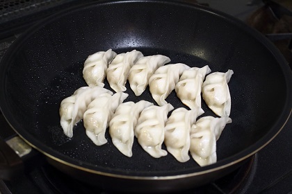 餃子を5分ほど蒸し焼きます。蒸し焼く時間は調理環境によって異なりますので、餃子に軽く焼き目が付く位の時間を見つけてください。 |