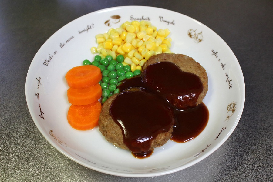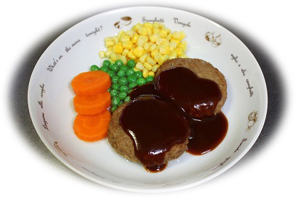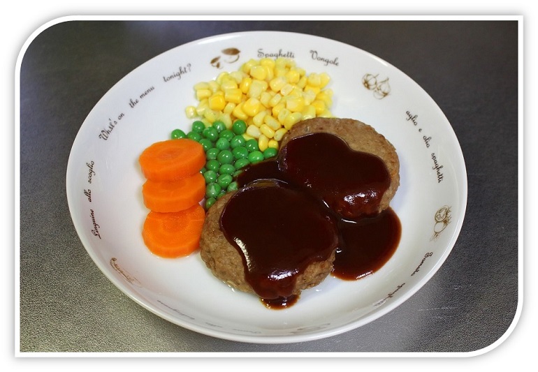 写真のように、ハンバーグ、にんじん、グリーンピース、とうもろこしを器に置き、デミグラスソースを適量かけて完成です。 |