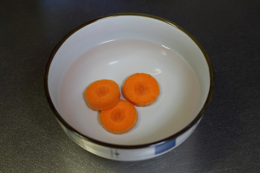 左の写真のように3片ほど「にんじん」を厚めに切り、器に入れ、水も入れ、これをレンジで温め、柔らかくした「にんじん」を用意しておきます。 |