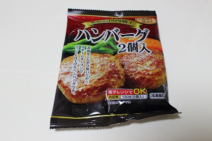 冷凍ハンバーグを用意しましょう。 写真の冷凍ハンバーグはローソンストア100で税別128円で購入した大変安価なものです。 (価格は購入当時のものです。) |