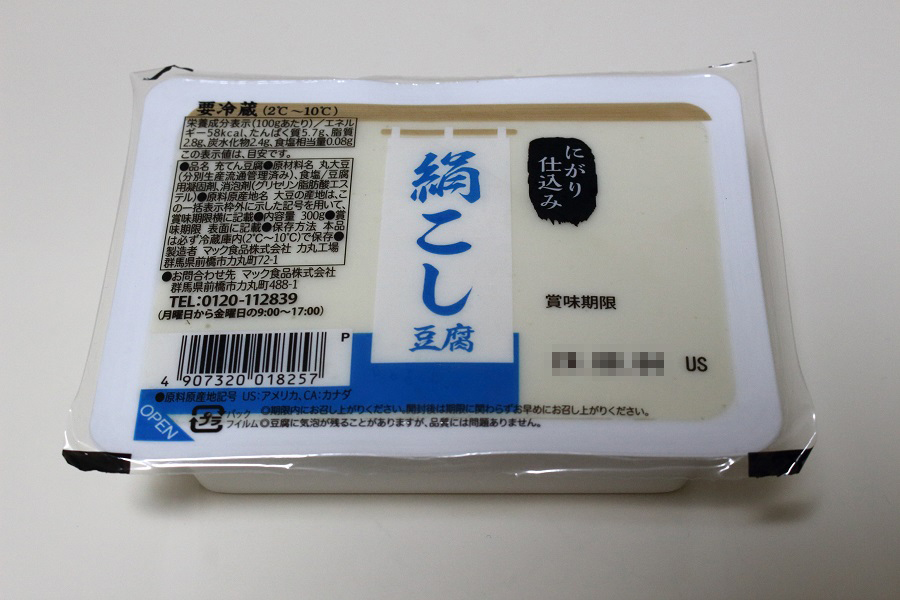 絹ごし豆腐(一丁)を用意しましょう。 写真の絹ごし豆腐(300g)はドン・キホーテで購入した40円くらいの大変安価なものです。 (価格は購入当時のものです。) |