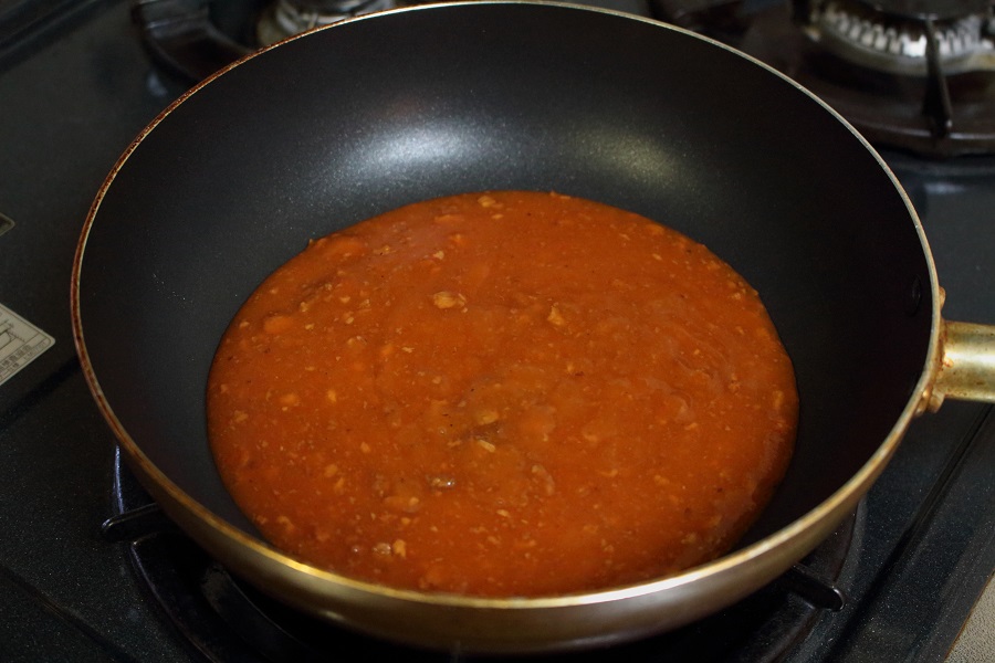 フライパンに麻婆豆腐の素を入れる。