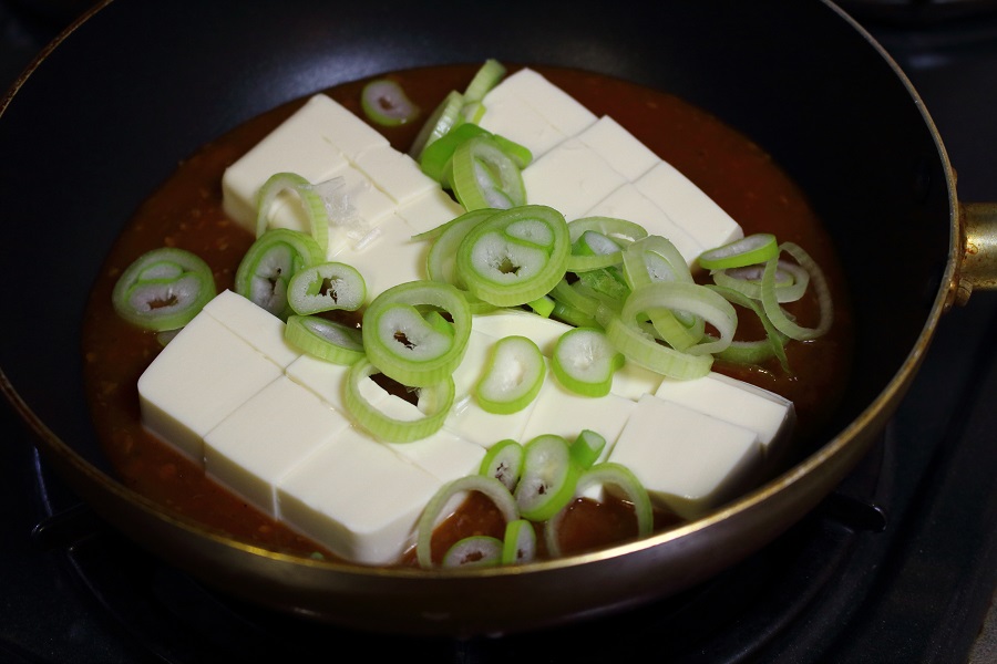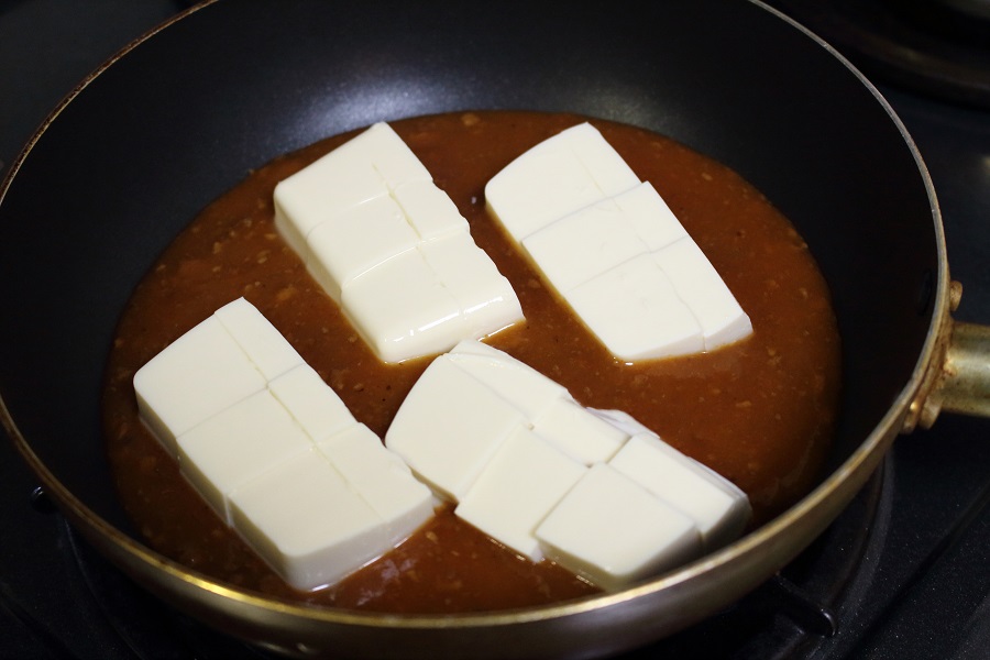 事前に切っておいた豆腐を写真のようにフライパンに入れます。 |