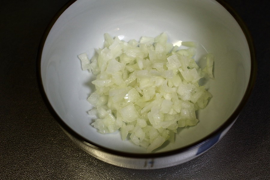 写真のように、玉ねぎ(1/4個)をみじん切りにしておきましょう。 |