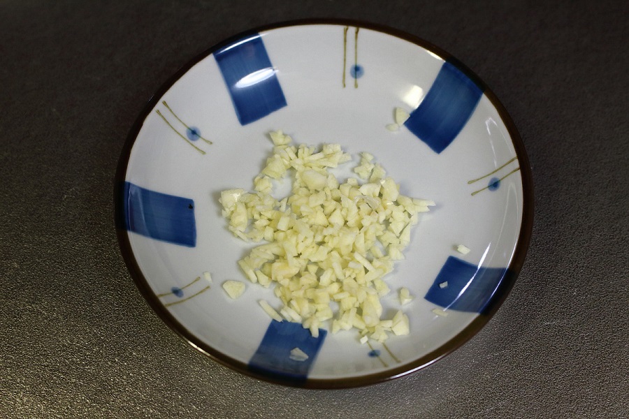 にんにく(1~2かけ)をみじん切りでカットして皿に入れておく。
