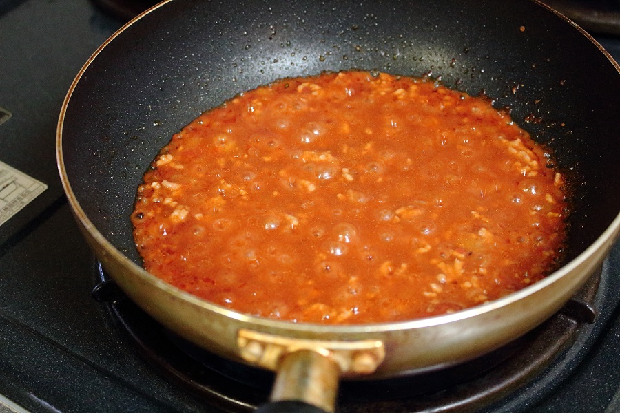 フライパンの火を中火に戻し、木べら(2本)で混ぜながら煮詰めていき、ミートソースをつくる。