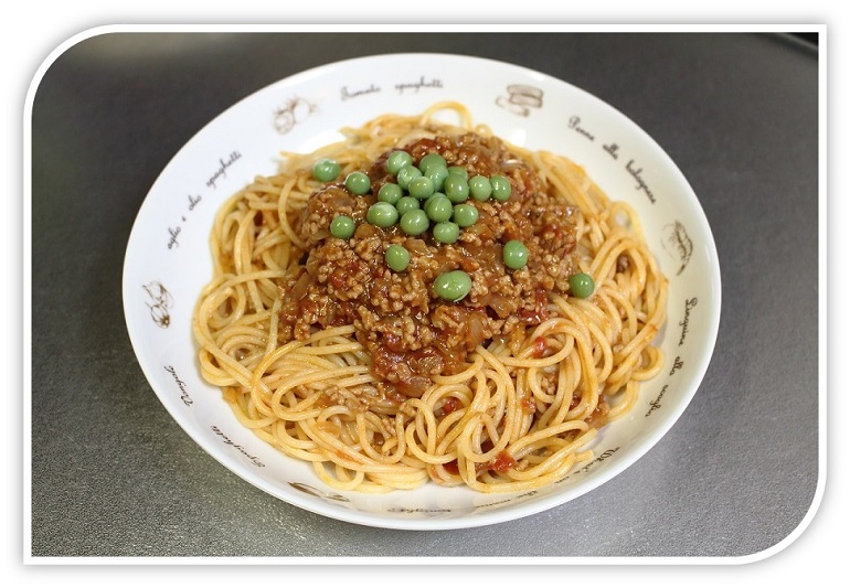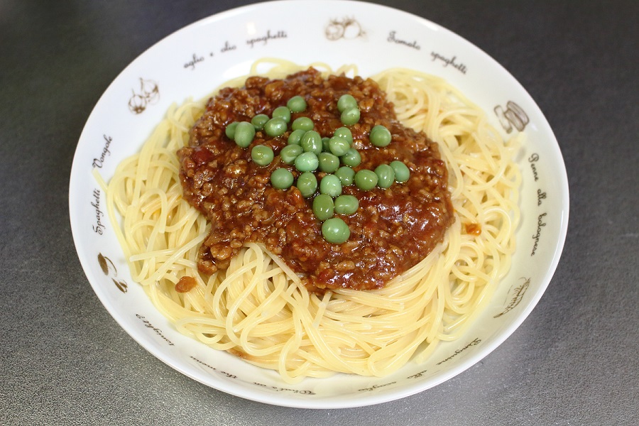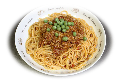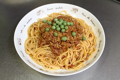 今回はパスタとミートソースを混ぜた盛り付けにしましたが、ネットの画像を見るとゆでたパスタの上にミートソースをかける盛り付け方法が多くみられます。下の写真はそのような方法で盛り付けたものですが、彩りもよく、これでもいいと思います。