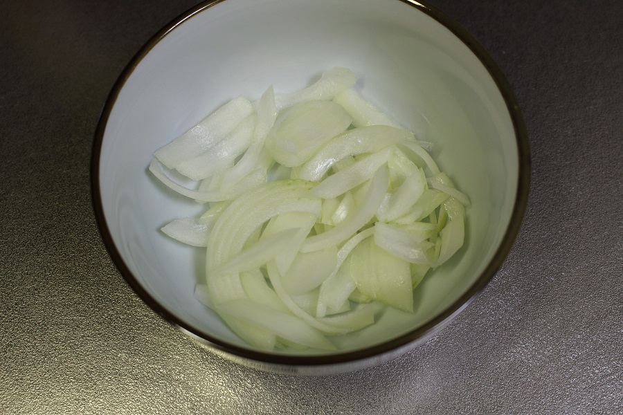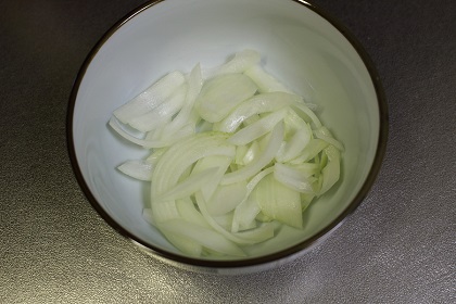 玉ねぎ(1/4個)を薄くスライスし、左の写真のように皿に入れておきます。 |