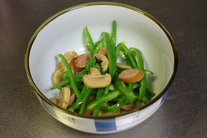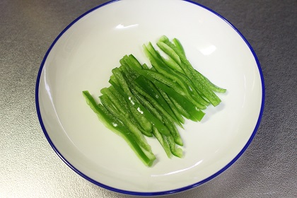 ピーマン(1個)を細くカットして皿に用意しておきましょう。 |