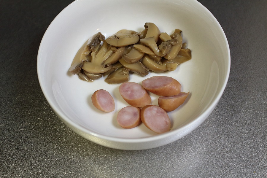 カットしたウィンナーと、缶から取り出した適量のマッシュルームを左の写真のように用意しましょう。 |