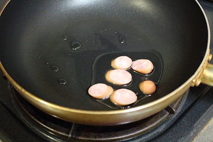 まずはカットしておいたウィンナーを炒めましょう。 |