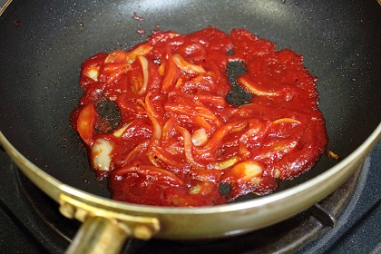 事前に用意しておいたケチャップを入れ、玉ねぎと混ぜながら煮詰めましょう。 |