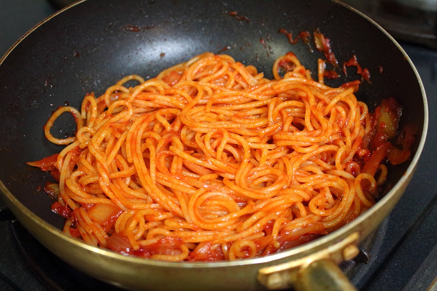 ケチャップと混ぜたパスタの色が薄ければ味も薄いので、その場合はケチャップを足して混ぜる。