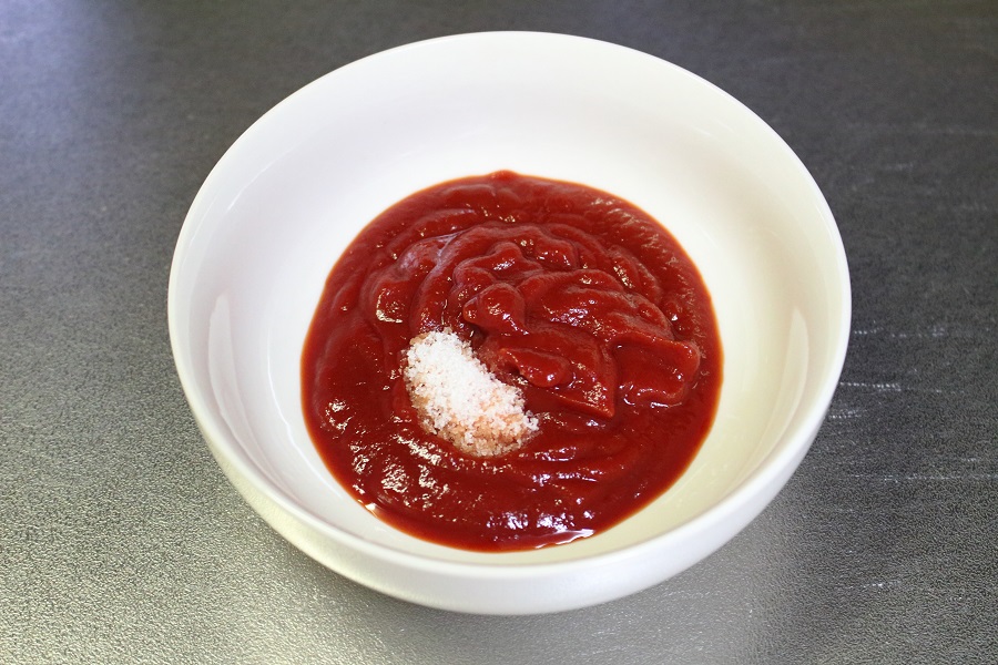 ケチャップ(大さじ4)を皿に入れ、更に塩(小さじ1/2)を入れて混ぜておく。