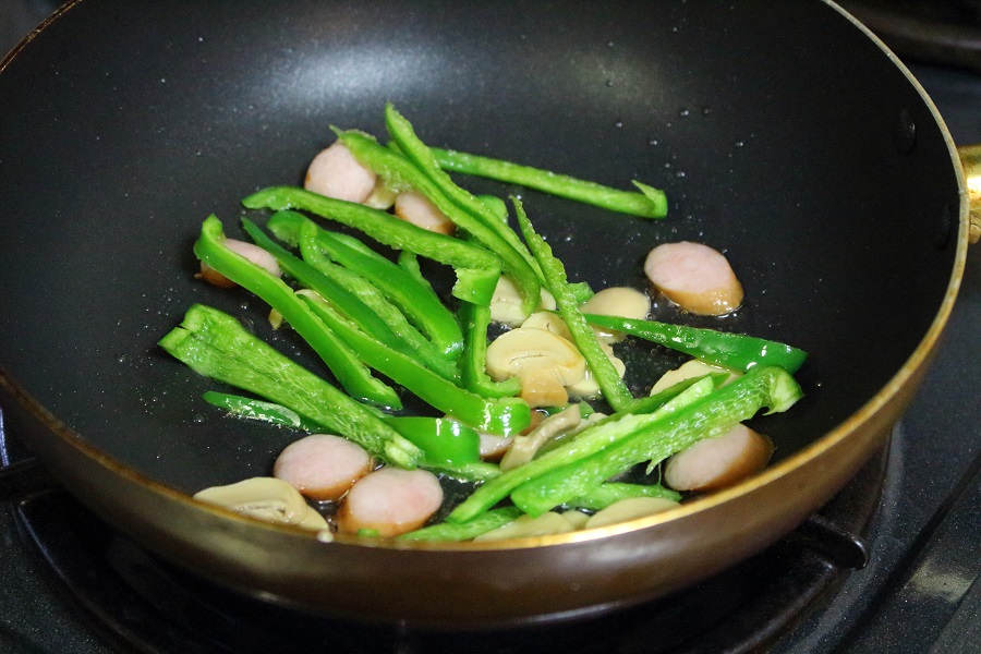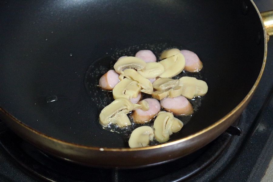 ウィンナーに続けてマッシュルームを炒めましょう。 |