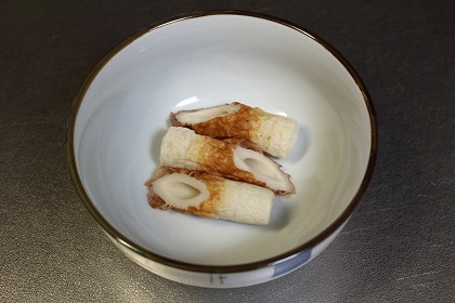 ちくわを斜めに切ったもの3片を具材として用意する。