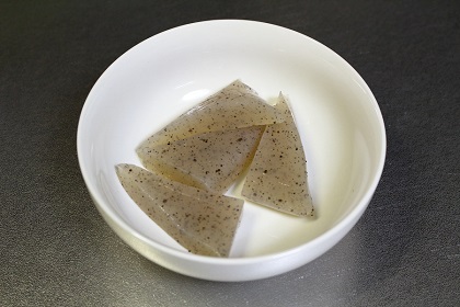 こんにゃくを長方形に切り、更に斜めに切った直角三角形を4つ具材として用意する。