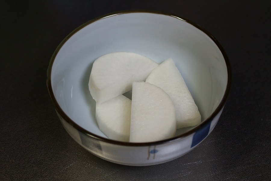 →片面に適度に包丁で切り込みを入れておく。 (おでんつゆを染み込みやすくするため。) →切った大根を器に入れ、水も入れラップして電子レンジで10分(500W)温め、柔らかくする。 (おでんの煮込み時間を短縮するため。電子レンジで温めている間は他の作業を進める。) |