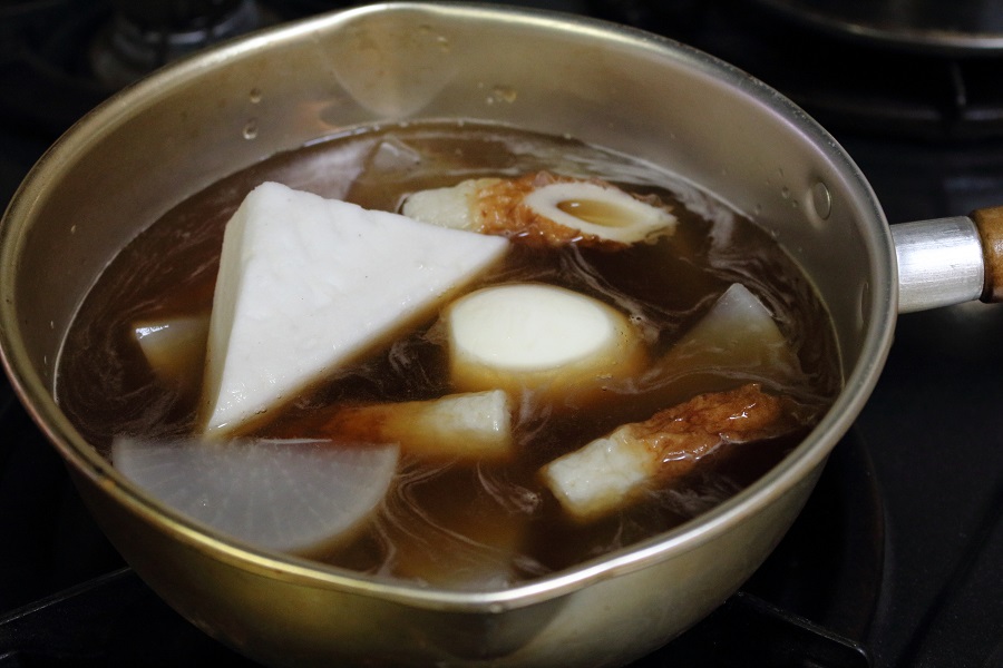 最後におでんの具材についてですが、今回は大根、ちくわ、ごぼう巻き、はんぺん、こんにゃく、ゆで卵を使ってみました。いずれもおでんの典型的な具材であるとは思われますが、これら以外の具材を使っても、もちろん良いと思います。例えばがんもどき、ちくわぶ、もち巾着、しらたき、昆布など。おでんの具材には様々なものがあります。お好きな具材でおいしいおでんを楽しんでいただければと思います。