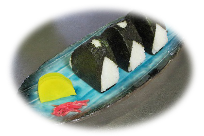 →おにぎりがまな板にくっついているので水で濡らした「へら」でまな板から取るようにする。 →味付け海苔の片面を軽く水で濡らし、おにぎりにピタッと付くようにする。 |