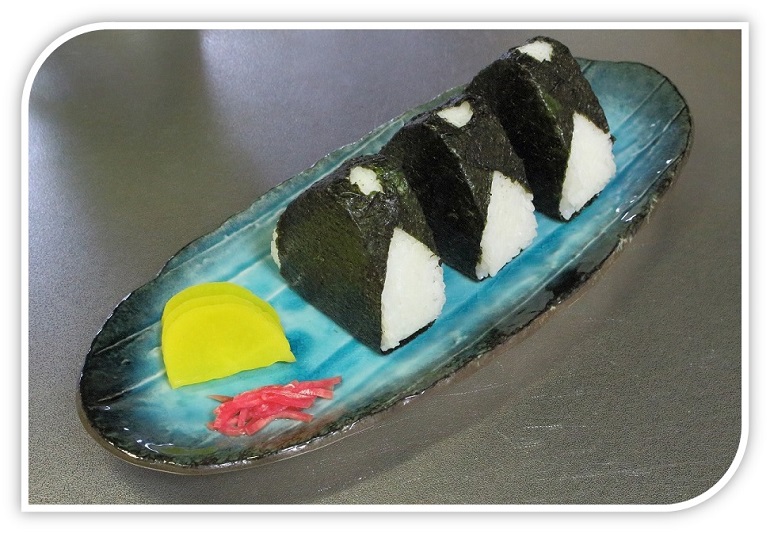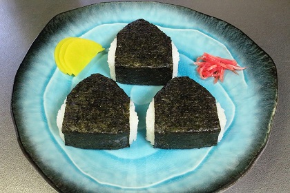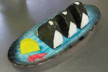 上記の皿におにぎりを縦置きで3個盛り付けた例。おにぎり自体は地味な色ですが、皿が見栄えを良くします。 |