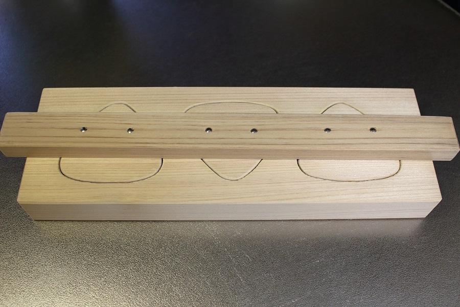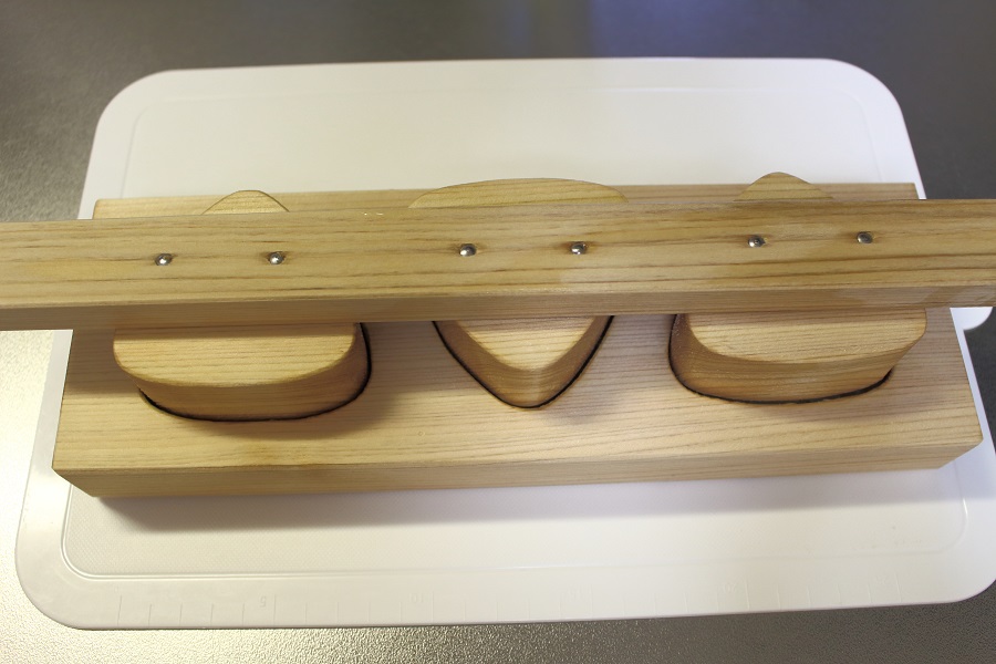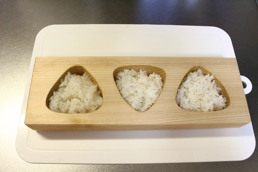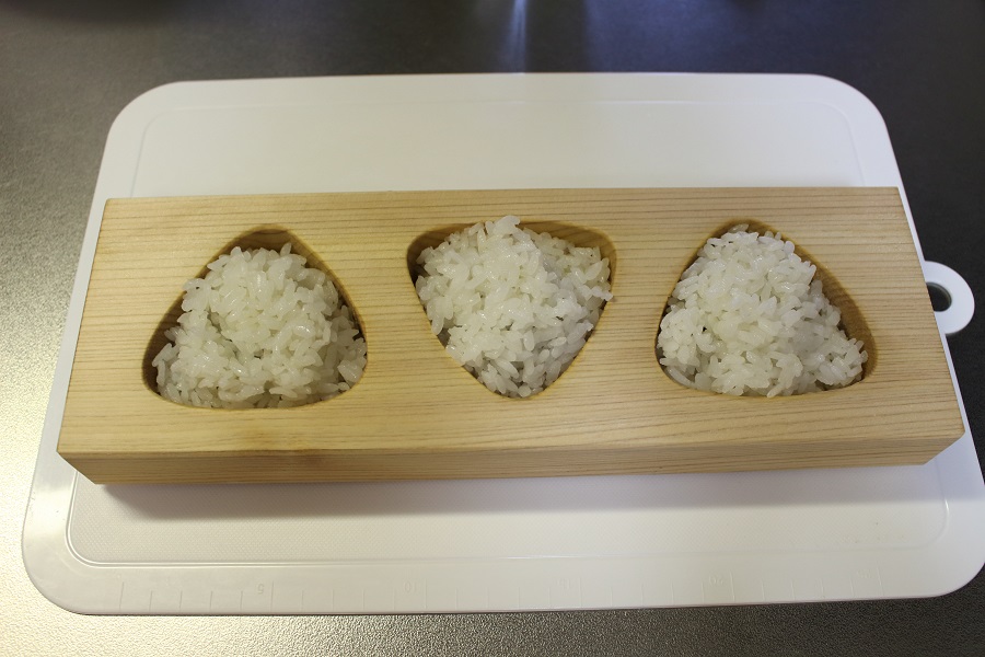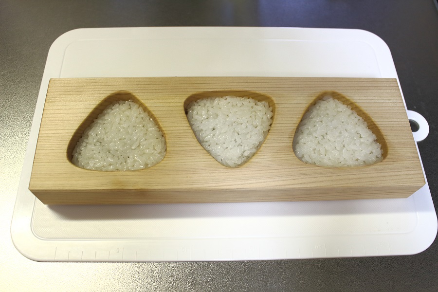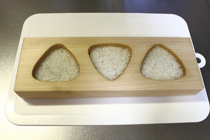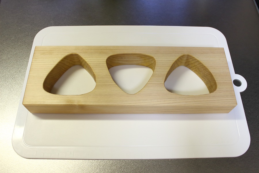 今回のおにぎり作成で使用した木製の「おにぎり型」。材質は檜(ひのき)ですがプラスチック製のものも売られています。 |