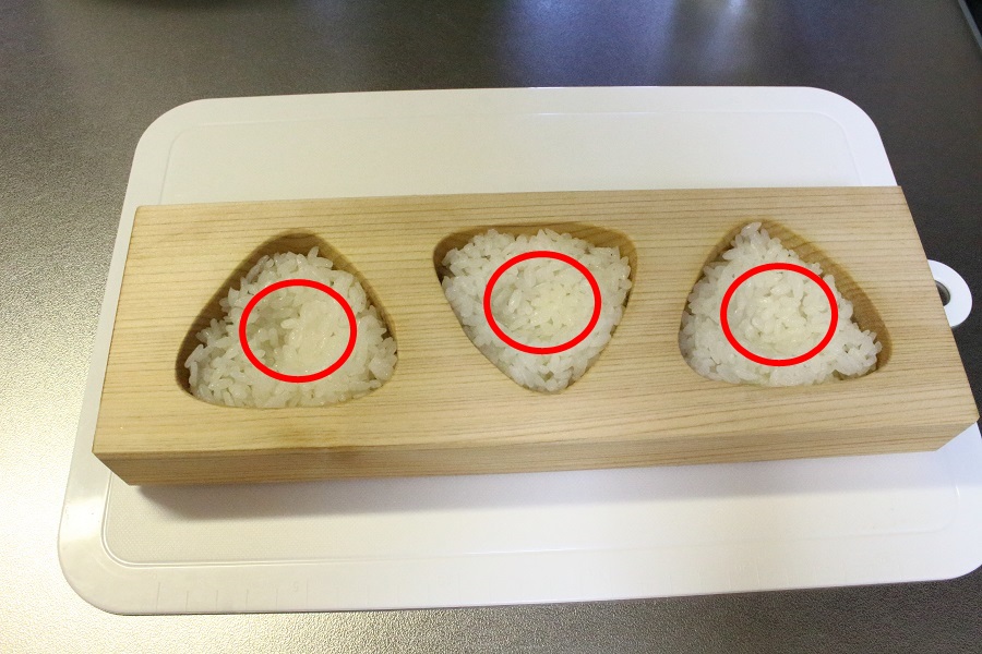 →しゃもじやおにぎり型に米粒がこびりつかないよう、炊飯器のご飯を掬うときに水でしゃもじを濡らす。 ただし水を使いすぎるとおにぎりがポロポロになるのでその点を注意し、適度に濡らす。 →しゃもじでなるべくまとめておにぎり型の深さの約3/4ぐらいまでご飯を入れる。 このとき、おにぎりが水でポロポロにならないよう、なるべく少ない回数で大きくまとめて入れる。 |