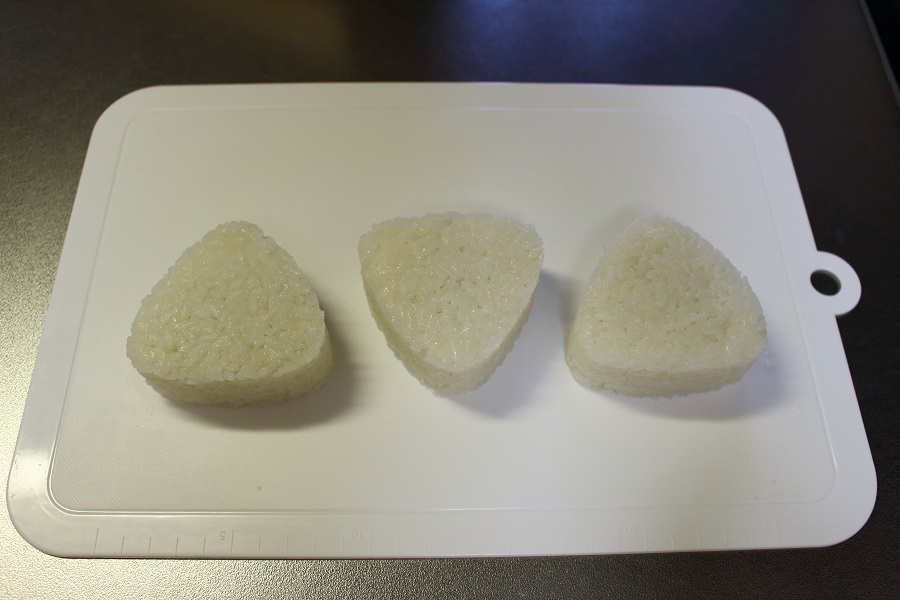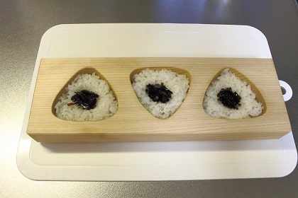 最後におにぎりの握り方と具材についてですが、握り方は「しっかり」握る方法や「軽く」握る方法があります。味の点から言うと「軽く」握るほうが良いようです。軽く握ることで食べたおにぎりが口の中でさっとほぐれ、美味しく食べられるとされています。一方で「しっかり」握ると、おにぎりを食べるときにご飯がポロポロ落ちずに「食べやすい」という長所もあると思います。(コンビニのおにぎりなどがその例です。)この辺はお好みだと思いますので握り方は自由に調節していただければ良いと思います。(今回のようにおにぎり型を使う方法では押器の押し加減でおにぎりの固さが調整できます。)またおにぎりの具材については、今回「昆布」「おかか」「ツナマヨネーズ」を使っていますが、他にもいろいろな具材が考えられます。「しらす」「焼きたらこ」「鮭」そして各種の「漬物」など、おにぎりには様々な具材が合います。お気に入りの具材をおにぎりで楽しんでみてはいかがでしょうか。