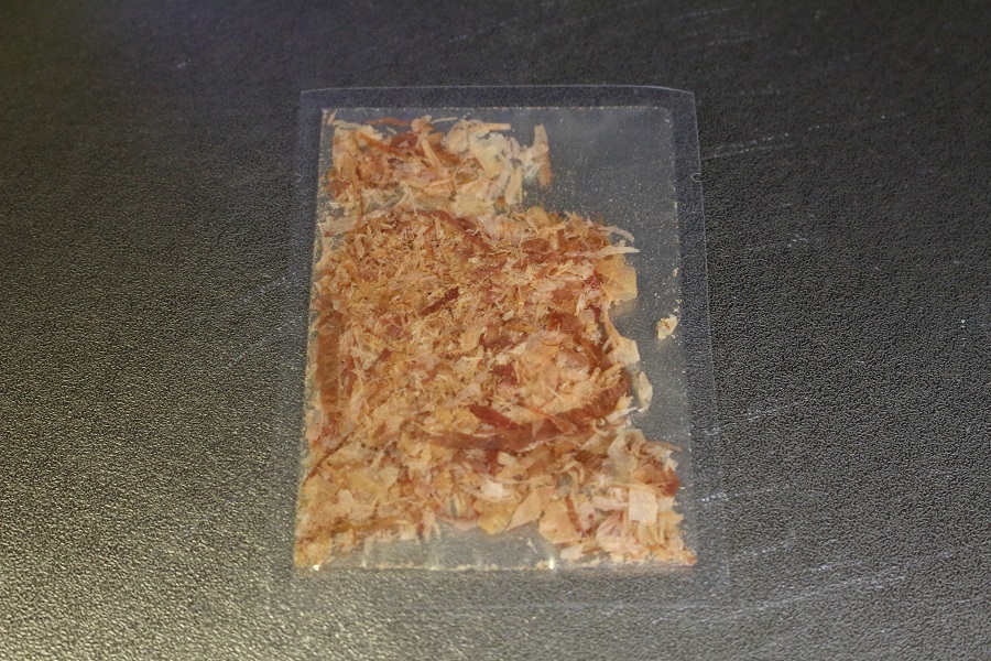 今回用意したかつお節パック(写真左)は1袋に2gのものです。これを器に入れます。 |