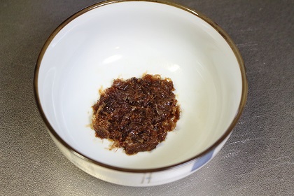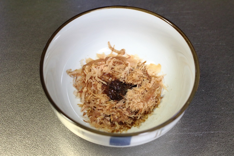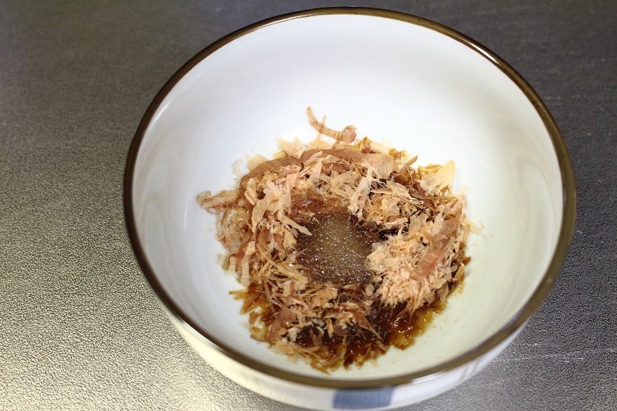 左の写真のように、器のかつお節に醤油を入れます。 |