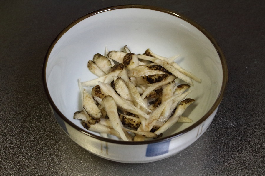 →事前にごぼうの泥を水で洗い落とし、更に包丁の背である程度、こそいでおきます。 その状態でごぼうを「ささがき」に切り、切ったごぼうはザルで軽くさっと水洗いして使います。 |