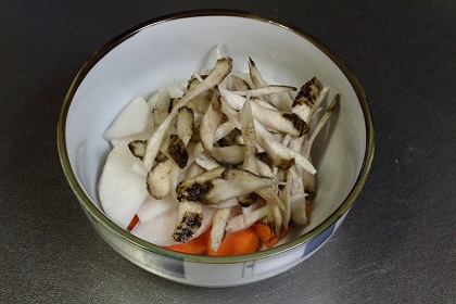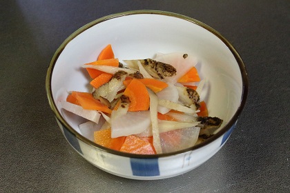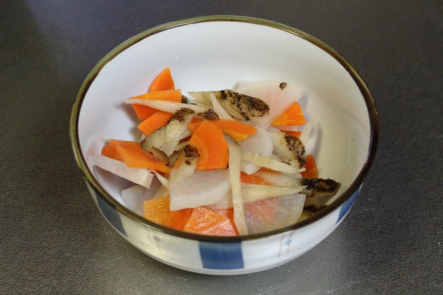 にんじん、大根、ごぼうを皿に入れた様子。これに水を入れラップし電子レンジで温めて柔らかくします。 |