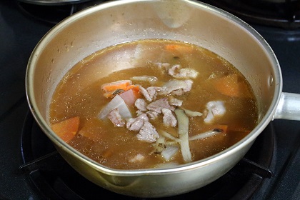 豚汁を温めるため、雪平なべに火をつけ沸騰させ、豚汁を温めます。 |