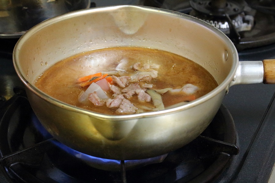 雪平なべに火をつけ、豚汁をある程度沸騰させる。