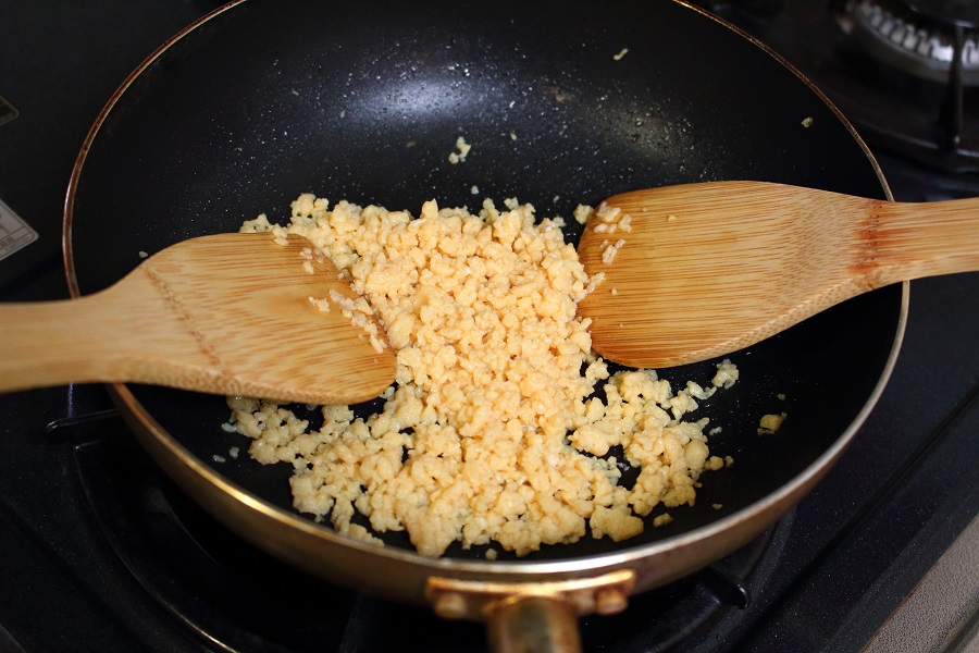 手順4の②で作った炒り卵を、2本の木べらを使って写真のように細かくしましょう。 |