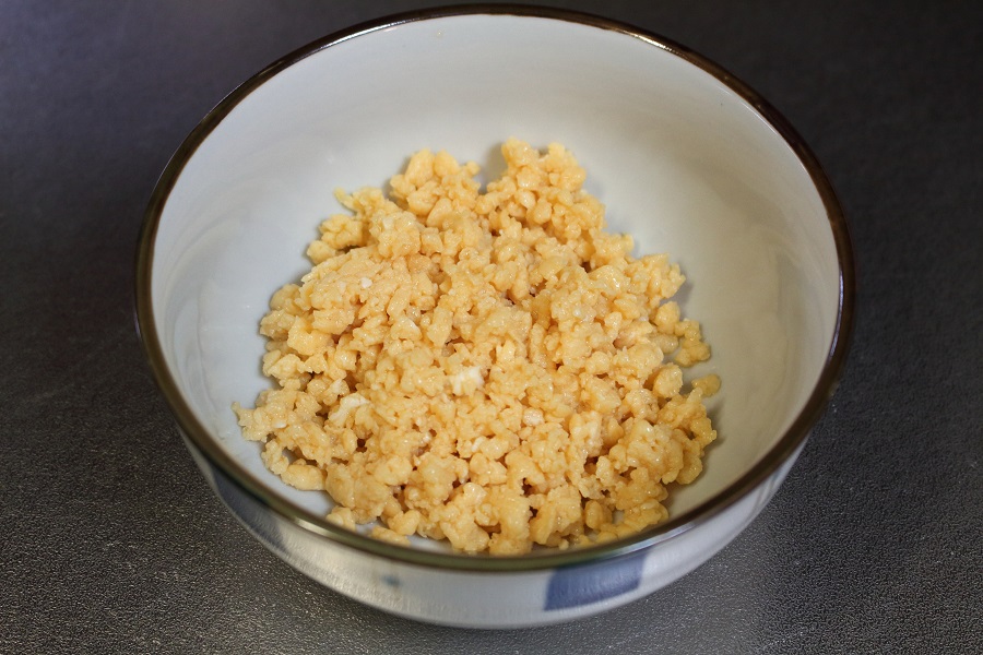 細かくした炒り玉子を入れた器です。この写真ぐらいに細かくしましょう。 |