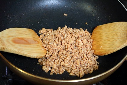 写真のように鶏ひき肉に「たれ」をからめながら煮詰めていきましょう。ひき肉の色(=味の濃さ)が薄ければ醤油を追加して、好みの色(=味の濃さ)にしてください。 |