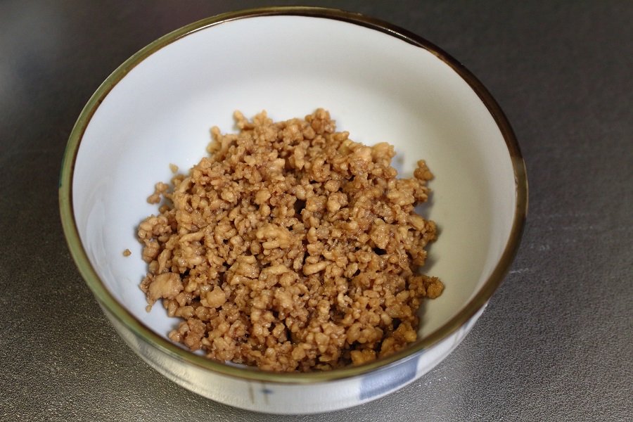 煮詰めた鶏ひき肉をいったん器に入れておきます。 今回は味を濃いめにしたかったので多めに醤油を追加しました。そのため左の写真ではひき肉の色もやや濃いめになっています。 |