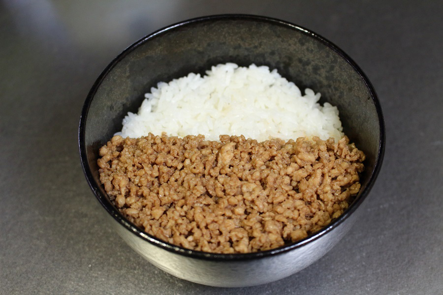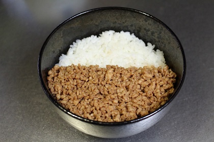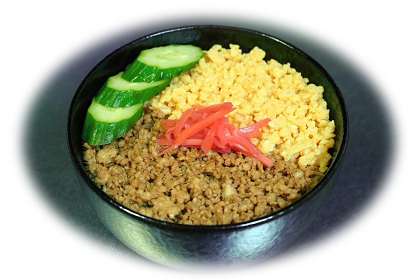 鶏そぼろ丼を「三色丼」と捉えた場合、1、2色目は、鶏挽肉の「茶色」と